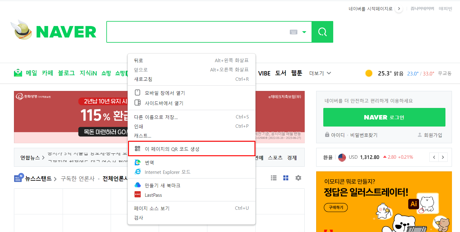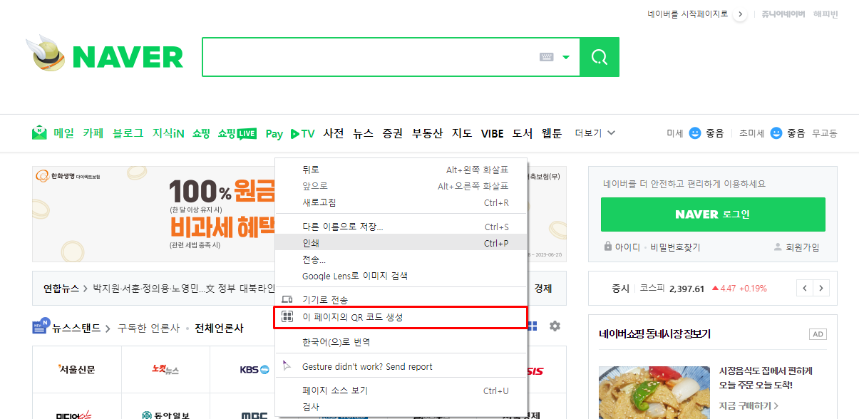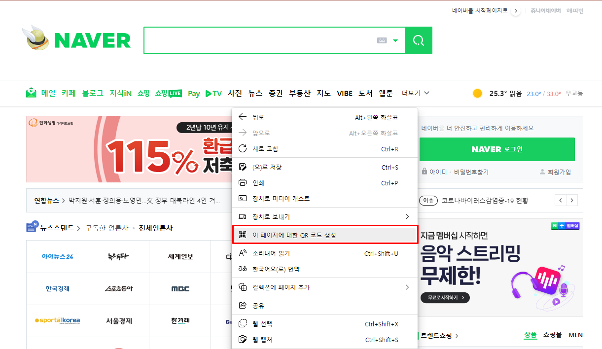 1. 우선 크롬의 경우 화면에서 마우스 오른쪽 클릭을 한 다음 '이 페이지의 QR코드 생성' 을 클릭하고