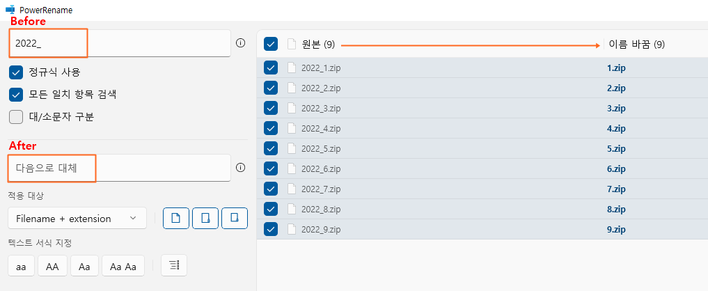 파워토이 안에는 여러가지 작은 프로그램들이 포함되어 있는데 그 중에서 PowerRename 을 가장 유용하게 사용하는 중입니다.